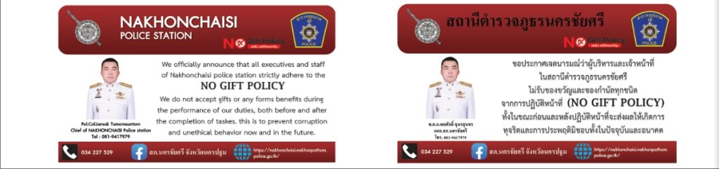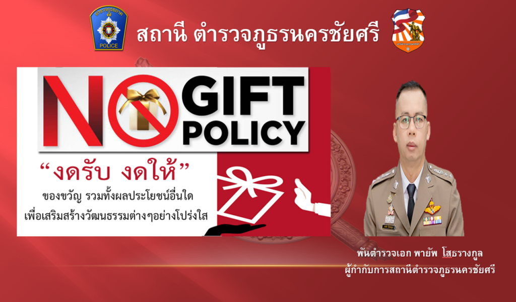 - ประกาศสำนักงานยุทธศาสตร์ตำรวจเรื่องเจตนารมณ์ที่จะไม่รับของขวัญหรือของกำนัลทุกชนิดจากการปฏิบัติหน้าที่